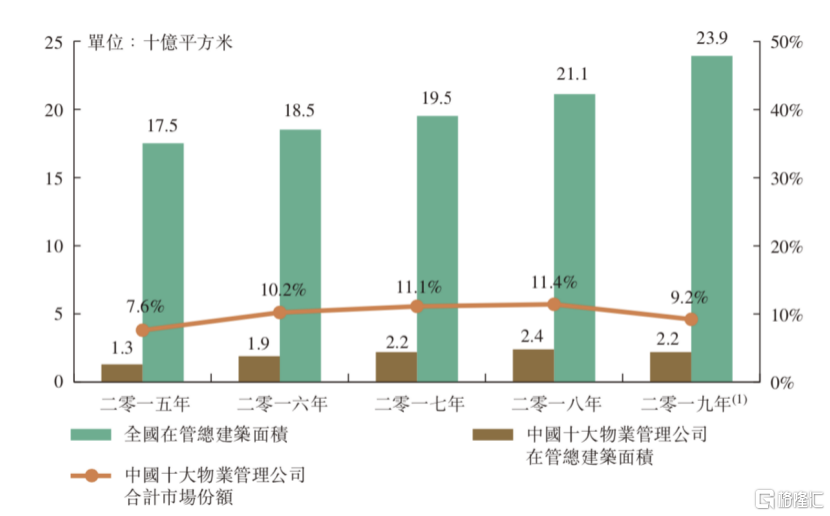 目前(按2019年末)中國十大物業管理公司在管面積的市場份額尚不足10%,而按照物業管理協會的統計,此前已經上市的24家物業管理公司的市占率接近 12%。從按2019收入計算,這24家上市物業管理公司的收入占比或低于行業整體收入的3%,若以終局的眼光來看,這絕對不會是一個行業成熟的狀態,這意味著未來數年之內,行業集中度快速提升會是大勢所趨,在這個過程中,最為受益的群體必然會是行業內頭部企業。
